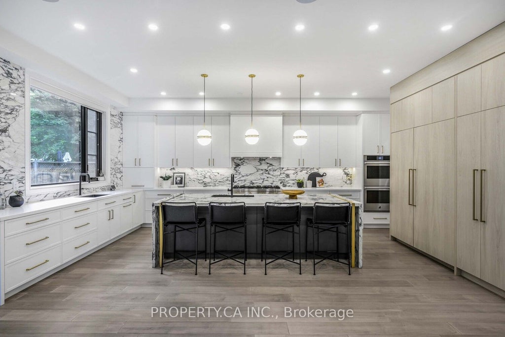 Welcome to 8 Manor Haven Road A Custom Home Across from the Park!This beautifully designed 4+1 bedroom, 6-bathroom home offers over 3500 sqft luxurious living in a prime family-friendly location. Designed by Shaun Lipsey, it features premium finishes and a thoughtful, functional layout throughout. The main floor features 10ft ceilings, pre-engineered hardwood floors, pot lights, and floor-to-ceiling inline windows that flood the home with natural light. Spacious principal rooms include a formal living room and a large separate dining room, ideal for entertaining. The chefs kitchen by California Kitchens is a true showstopper, equipped with top-of-the-line JennAir appliances, including a side-by-side fridge and freezer, two wall ovens, and a massive 10-ft island with ample seating. A dedicated prep space with drink fridge, paired with a huge walk-in pantry offer exceptional storage and prep space. The family room features a cozy fireplace framed by a stunning floor-to-ceiling granite feature wall, creating a dramatic and welcoming focal point.Upstairs, you'll find four spacious bedrooms and three full bathrooms, including a primary retreat with a walk-in closet by Closets by Design and a spa-like ensuite with heated floors.The finished basement offers 1570 sqft includes a fifth bedroom, full bathroom, and a large open-concept rec space ideal for a home office, gym, or guest suite. A built-in bar adds flexibility for entertaining. Additional highlights include a heated mudroom, built-in Sonos surround sound, gas BBQ hookup, and a large private backyard. Located directly across from a park, this home delivers top-tier quality, comfort, and modern family living