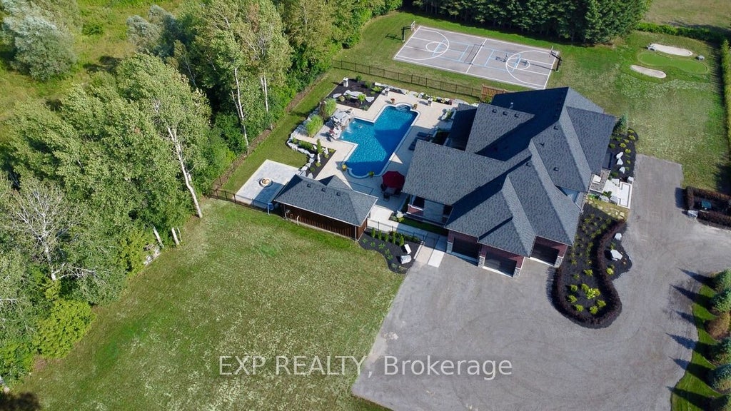 Welcome to an extraordinary estate where luxury, comfort, and convenience effortlessly converge. Nestled privately behind two custom homes on a sprawling 1.77-acre lot, this exceptional residence is an entertainer's paradise, thoughtfully designed with impeccable craftsmanship and timeless elegance. At the heart of this home lies an extraordinary gourmet kitchen featuring custom cabinetry and an expansive double butler's pantry with a secondary back kitchen. Each bedroom serves as a luxurious private retreat with spa-inspired ensuite bathrooms. The primary suite redefines opulence with a custom-designed five-piece ensuite and a dressing room spacious enough to serve as an additional bedroom. This suite also offers seamless walk-out access to a professionally landscaped backyard oasis. Soaring ceilings are complemented by plaster crown moulding, exquisite millwork, and built-in speakers. A thoughtfully designed open-concept layout seamlessly connects the family room, main-floor bedroom, and a combined mud and laundry room with garage access, enhancing everyday living. The finished basement epitomizes high-end leisure and entertainment, featuring a full-size bar, gym, stereo surround sound, and five TVs, including a 120-inch home theatre screen and an inviting fireplace. Step outside to your private resort's meticulously landscaped yard, enveloped by lush, low-maintenance gardens and frequented by nature, including occasional deer sightings. Enjoy endless relaxation and entertainment with a custom pool, waterfall, hot tub, covered patio with dual built-in grills, and a change room. Also included: your very own 100-foot golf hole, full-size basketball court, and pickleball court, transforming every moment into a five-star experience. This distinguished property offers a rare opportunity to own a home designed for the most discerning homeowner, providing unparalleled luxury and an idyllic retreat in an exclusive, serene setting.