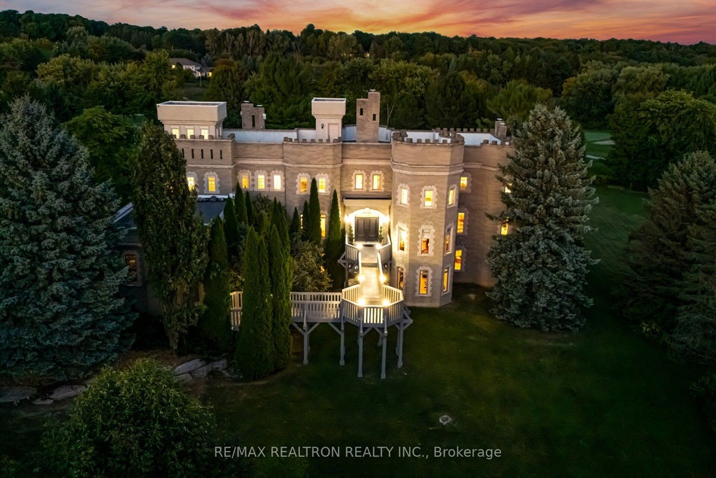 A Castle on the Golf Course - First time ever offered for sale, this one-of-a-kind residence is a true architectural treasure. Custom-built by Lebovic Homes and originally showcased by the Canadian Cancer Society Designer Showcase, this remarkable estate is set on 2 private acres backing directly onto the golf course. Privately tucked back from the road, guests are welcomed onto a grand front deck that sets the stage for the elegance within. The impressive foyer is anchored by a two-storey stone fireplace, enhancing the homes sense of grandeur and warmth. The living room offers a sophisticated yet inviting space for both relaxing and entertaining. The formal dining room features a dramatic two-way fireplace, soaring ceilings, and detailed crown mouldings, creating the perfect backdrop for memorable gatherings. A private home office adds character with aged walls and a hand-painted mural. At the heart of the home, a neo-classical kitchen blends timeless design with function, opening to a versatile family room with its own fireplace and two walkouts to the expansive deck overlooking the golf course. Upstairs, the master suite is a serene retreat, featuring a walk-in closet and a spa-like 6-piece ensuite. Three additional bedrooms each enjoy their own ensuite baths, including one extraordinary train room set a whimsical escape for hobbyists of any age. The lower level extends the living space with a finished basement, offering a games room, recreation area, and a unique sub-basement, providing endless possibilities for entertaining or relaxation.