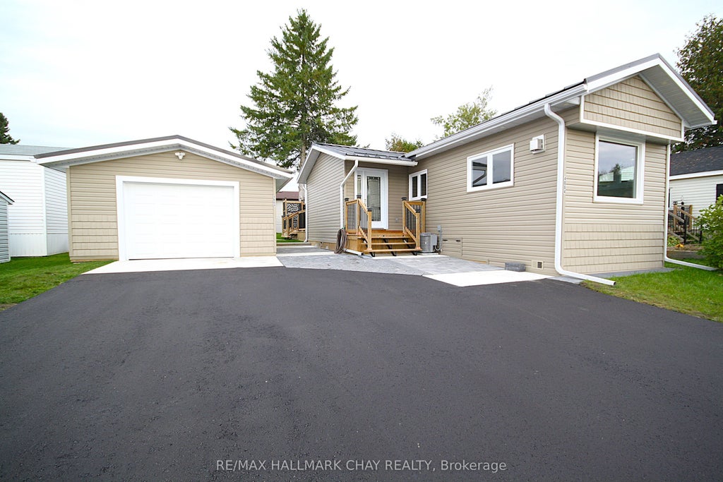 WOW! NEW, NEW, & MORE NEW! Completely renovated or rebuilt inside and out. This move in ready home has been recreated just for you to enjoy for many years to come. Too many upgrades to list...Featuring All new in 2024/25; steel roofs on all 3 buildings, siding, soffit, fascia, troughs, exterior lighting, huge new asphalt driveway, paver stone, all new windows, and exterior doors, new decks, upgraded insulation, drywall, flooring, totally new bathroom, 5 brand new appliances, new central air unit, all flooring, all interior trim, doors, and paint, lighting, and much much more! Walk out to large private deck. Pride of ownership and attention to details abound. Garage was taken down to foundation and rebuilt with new framing, insulated walls and doors, windows, garage door opener, and hydro. Amazing opportunity. Located close to Orillia and major amenities. Land lease fee includes taxes, water, road maintenance, garbage removal.
