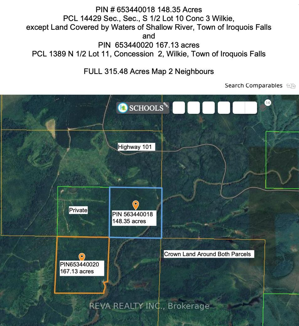 Near Mathesson, Ontario, lies 315 acres of forested Canadian Shield land with access off Highway 101 and/or across Crown Land logging roads. The 167.13 acre and 148.35 acre parcels are surrounded mostly by Crown Land. Great for hunting land, recreational land or investment. Off Grid, no hydro, well, septic, or direct access from a municipal road. The 148 acre parcel is closest to Highway 101, please review the maps carefully. Recently harvested neighbour's lands will have moose, deer, etc., feeding on new growth next door. The Shallow River borders these 2 parcels on the east the property's southeast corner, where rapids and canoeing exist. Showings with a Realtor, please, no trespassing.