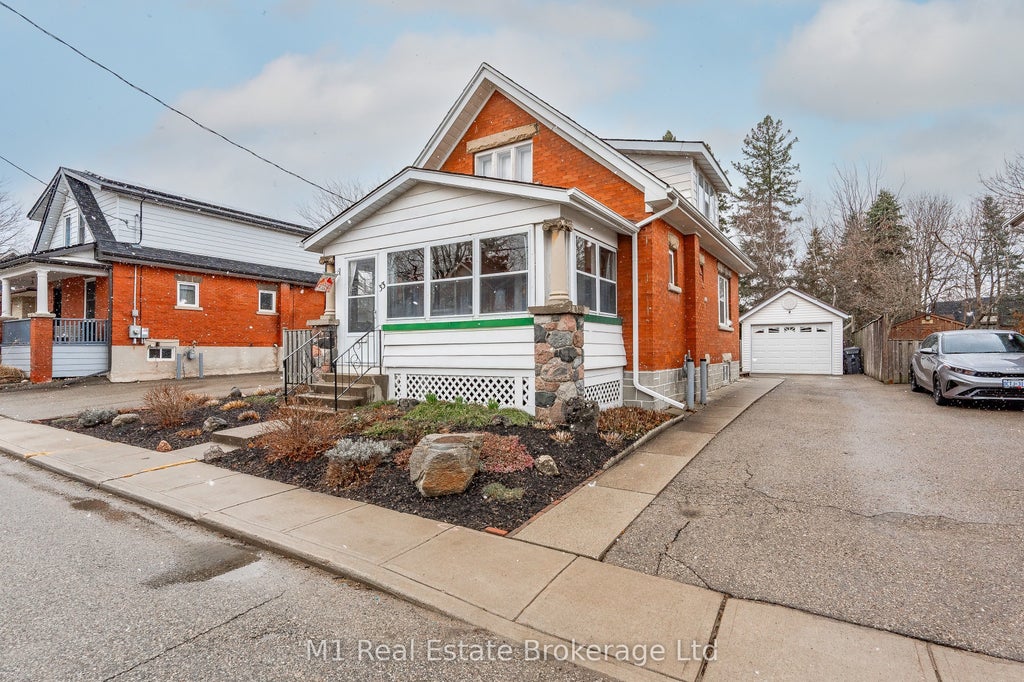 Charming Red Brick Home in the Heart of Guelph. Step into timeless character and modern comfort with this delightful 1 1/2 storey home, nestled in the sought-after Exhibition Park neighbourhood. Offering 3 spacious bedrooms and 1 full bathroom, this home is full of warmth, charm, and personality.You'll love the inviting layout, featuring unique architectural details, original hardwood accents, and plenty of natural light. One of the standout features is the inviting covered 3-season porch, the perfect spot for morning coffee, evening chats, or simply enjoying the peaceful surroundings. Out back, a newer-built detached garage is an impressive addition, fully equipped with central vacuum, making it an ideal space to care for your vehicles or set up a workshop. Parking for up to 4 cars is a huge bonus in this neighbourhood. Perfect for families, first-time buyers, or anyone looking to enjoy a vibrant, walkable neighbourhood rich in history and community spirit.Located just steps from parks, schools, trails, and downtown amenities, this home offers both charm and convenience in one of Guelph's most desirable areas. All furnishings in the home can be included.