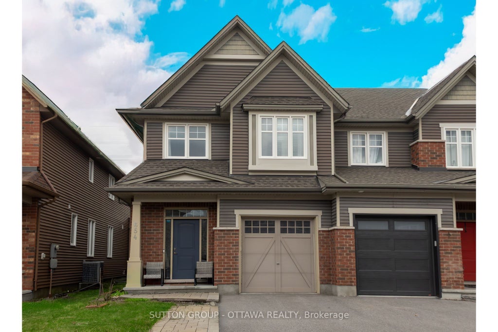 Welcome to this stunning 2,500 sq. ft. semi-detached townhome in Kanata's sought-after Trailwest community. This spacious 3-bedroom home includes a large loft that can easily be converted into a 4th bedroom.The main floor features beautiful hardwood floors, high ceilings, and abundant natural light. Enjoy a cozy family room with a gas fireplace, a formal dining area that flows into the living room, and a stylish kitchen with stainless steel appliances, ample cupboard and counter space, a pantry, and a bright eat-in area. Upstairs, you'll find three generously sized bedrooms, a convenient laundry area, and a versatile loft space. The primary bedroom includes a walk-in closet and a luxurious ensuite with a soaker tub, glass shower, and double sinks.The fully finished basement offers large windows for a bright, welcoming atmosphere, a rough-in for a bathroom, and plenty of storage.Outside, relax in the fenced backyard featuring a garden and a deck perfect for entertaining. **Prime location!** Walking distance to parks, splash pad, Trans Canada Trail, Superstore, Walmart, gym, restaurants, major bus routes, and more. **Offers welcome anytime!** . Some Pictures Virtually Staged.