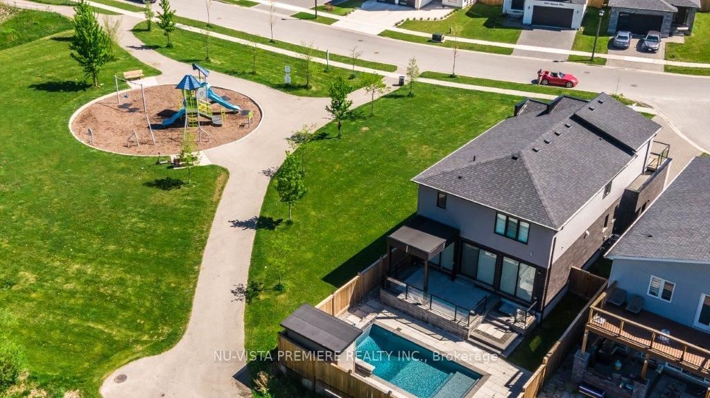 Welcome to this beautifully appointed 4-bedroom home nestled in a prestigious North London neighbourhood. Step through the inviting front entrance into a bright and spacious foyer, setting the tone for the open-concept main floor designed with both comfort and sophistication in mind.The heart of the home features 9' ceilings and expansive 8' windows in the great room, flooding the space with natural light. A cozy fireplace anchors the living area, flowing seamlessly into a stylish dining space and a gourmet kitchen. The kitchen is a chefs dreamshowcasing quartz counter tops, high-end finishes, modern appliances, and generous counter space for meal prep and entertaining.Step outside to your private backyard oasis, completely redesigned in 2023 with over $200,000 in backyard & professional landscaping. This outdoor retreat is fully fenced and features an in-ground pool with a cascading waterfall, ambient lighting, elegant stonework, and lush greenery. The back patio highlights exceptional craftsmanship and offers breathtaking views of nearby green space and a tranquil pond. Scenic walking trails are just steps from your door.Upstairs, the second floor offers four generously sized bedrooms and two full bathrooms. The primary suite is a true sanctuary, complete with a walk-in closet and a spa-inspired ensuite featuring a sleek glass shower and luxurious in-floor heating. A charming balcony overlooks the quiet, tree-lined streetperfect for morning coffee or an evening unwind.Additional features include:Hardwood floors in the great room, Ceramic tile flooring in all wet areas, Air conditioning, Paver stone driveway, Quartz counters in the kitchen and powder room, Rough-in for a future bathroom in the basement.Comprehensive security system with motion cameras and fire alarm connectivity (live monitoring subscription required)This home effortlessly combines modern elegance with everyday functionality. Dont miss your chance to own this exceptional property.