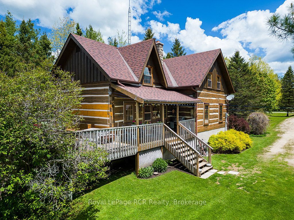 Full-log retreat on 5 private acres with a 3-bay shop. A covered front porch leads into the country kitchen with breakfast nook, a wood-burning cookstove, and a walkout to the side deck for morning coffee. Main floor laundry and a handy 2-pc bath. The heart of the home is a spacious dining/living room where wide-plank floors and a stone fireplace set the tone for relaxed family time and easy entertaining.Upstairs are four bedrooms, including a generous principal with cheater access to a 5-pc bath featuring a classic roll-top tub. The fourth bedroom is an ideal nursery, office, or dressing room. The finished lower level extends your living space with a cozy rec room warmed by a woodstove, plus a hobby room and a wood/utility storage area.Outside, enjoy room to roam: mowed trails weave through the property to a natural, seasonal stream at the west edge. The detached, L-shaped approx. 1,359 sq ft garage/workshop offers excellent space for vehicles, tools, and toysperfect for the hobbyist. Just a short drive to town amenities, this is comfortable country living with character, privacy, and plenty of space to make it your own.