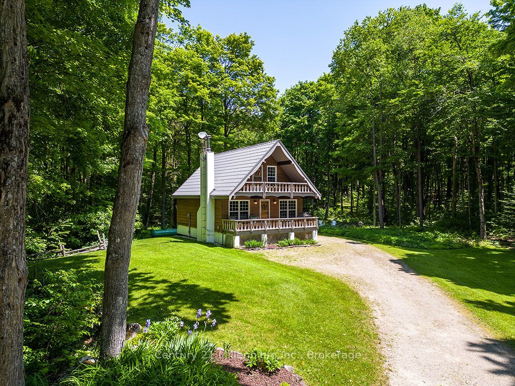 A Nature Lover's Paradise! Tucked away on 8.7 acres of mature hardwood forest, this lovingly maintained A-frame home offers a spectacular, private retreat or full time chalet. Surrounded by protected crownland this property offers unrivalled access to hiking, mountain biking, hunting, or peaceful walks through the woods. Inside, the home features 3 bedrooms and 1.5 bathrooms, with an open-concept kitchen, dining, and living space designed for entertaining and cozy gatherings. Enjoy morning coffee or evening sunsets from one of two spacious west facing decks - one off the main living area and another from the primary bedroom on the second story. Curl up with a good book beside one of two wood-burning fireplaces or gather around the fire pit in your spacious yard. There's room for all your toys and tools with a solidly built detached double car garage plus a storage shed and chicken run for your future hobbies. The partially finished lower level offers opportunity to expand your living space, or enjoy the recreational area as it is. Adventure lovers will appreciate the proximity to Kolapore Uplands, Osprey Trails, nearby snowmobile routes, plus only a 12 minute drive to Blue Mountain Resort or Osler Bluff Ski Club. This picturesque abode is located a short drive to all of the amenities in Thornbury and Collingwood while being far enough away for privacy, peace and tranquility. The Buyer of this home will appreciate the self-sufficiency and affordability that this property has to offer with abundant, high quality well water, an endless supply of firewood from your own forest, new furnace & a/c, durable metal roof, reasonable property taxes and low monthly covering costs. Your Blue Mountain adventure awaits!