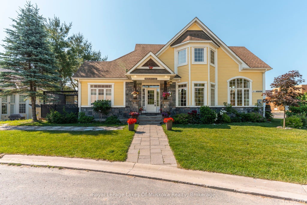 Experience refined living in this exceptional end-unit, located in the prestigious Waterways of Muskoka community, just steps from the Muskoka River and an easy stroll to downtown Bracebridge. Originally crafted as the model home, it showcases a collection of premium finishes and thoughtful upgrades that blend comfort with sophistication. Bathed in natural light from windows on three sides, the homes welcoming interior is bright and airy, especially during the afternoon sun. This home has an exceptional view from the living and dining room which look out on a park-like setting with one-hundred year old trees and gardens. A spacious front foyer leads into the great room, where a cathedral ceiling and a striking stone gas fireplace create a warm and elegant focal point. The open-concept design flows seamlessly into the dining area and upgraded kitchen, complete with granite countertops, ceramic tile flooring, modern lighting, and a generous island. The main floor primary bedroom suite features a vaulted ceiling, walk-in closet, ensuite, and direct access to the back deck with gazebo perfect for quiet mornings or evening relaxation. A powder room, convenient main-floor laundry, and direct entry to the attached garage complete the main level. Upstairs, an oak staircase leads to a loft-style landing overlooking the great room, along with three spacious bedrooms and a full 4-piece bath, ideal for family or guests. Additional highlights include hardwood flooring, upgraded baseboards and lighting fixtures, a solar-powered hot water tank, whole-home water filtration system, and fibre optic internet. The full unfinished basement offers endless possibilities for additional living space, complete with cold storage and a freestanding sauna. Outside, the landscaped grounds feature impressive perennial gardens, a stone walkway from the front steps to large deck. Snow removal and lawn maintenance are included in the monthly fee ($287), allowing for easy, carefree living.