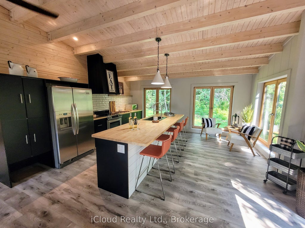 OPEN HOUSE SAT. OCT 25TH 10 AM-12PM. Get in before the snow flies! Recreational list that comes with this 2 yr old custom Panabode home: *SWIMMING, *FISHING and BOATING (into 2 lakes) is right across the road at your very own riverfront dock (16' 4" x12') *SNOWMOBILING (trail just 3 doors down at the end of this dead end road) *ATVing (BF allows you to drive right in through town (or join the Algonquin West ATV Club for access to 350 km of mapped trails) *WALKING/JOGGING/BIKING (Heritage Trail just 3 min. away)Waterfront property is not included in size of lot; it measures: 111.90 ft (waterfrontage) X 40 ft(side) X 88.6 (side) and 178.72 (road frontage)=.165 Acre. Total of two lots together = 1.01 Acre. Minimal car traffic on this road and the clump of trees in front of house provides ample privacy from the road. Circular drive allows many vehicles to be parked comfortably. ICF basement, over insulated walls and ceiling plus windows that exceed Canadian standards add up to savings on heating costs. Concealed speaker wire for livingroom tv extends to dining/kitchen area in wall speakers/tv. There are 3 entrances; one in each bedroom and main entryway has you walking onto a covered porch; allowing you to easily BBQ year round. Kitchen/dining area is open concept with vaulted ceilings, many over sized windows and butcher block counter with 4 stools to sit at. Sizable bathroom has heated floors and includes the laundry area. Between 2 bedrooms there is a room (7'11" x 7'3") meant to be walk-in closet but current owner didnt require one. Super set up for retirees with one floor living. Basement is same sq. ft as house, it measures 5 ft 11" tall, plenty of storage room. The property goes all the way back to Cameron St with trees in between so nobody can build there and cramp your space.