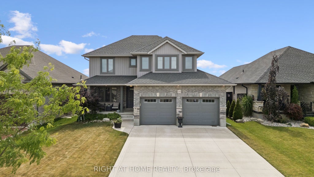 Welcome to 24 Oakmont - a stylish and spacious 4+1 Bed, 2.5 Bath home on a premium lot in the sought after Shaw Valley Community. Backing onto peaceful city-owned greenspace and a proposed park, this MP Custom Home blends function and flair with a concrete driveway, covered front porch, and beautifully landscaped yard. The entertainer's backyard features a two-tier deck with ambient lighting, a live-edge bar, and gas BBQ hookup. Inside, enjoy an open concept main floor with soaring vaulted ceilings, a bright GCW kitchen with quartz counters, island, backsplash, pantry and a cozy living room with electric fireplace. A main floor office/bedroom and stylish 2 pc bath complete the level. Upstairs offers a laundry room, two spacious bedrooms, a 4pc bath, and a serene primary bedroom with walk-in closet and spa-like ensuite with glass shower and freestanding tub. The finished basement includes a rec room with 8'2" ceilings, an extra bedroom, rough-in bath, and storage. Steps to Daycare, close to Port Stanley Beach, close to 401, Amazon Fulfillment and just minutes from London!