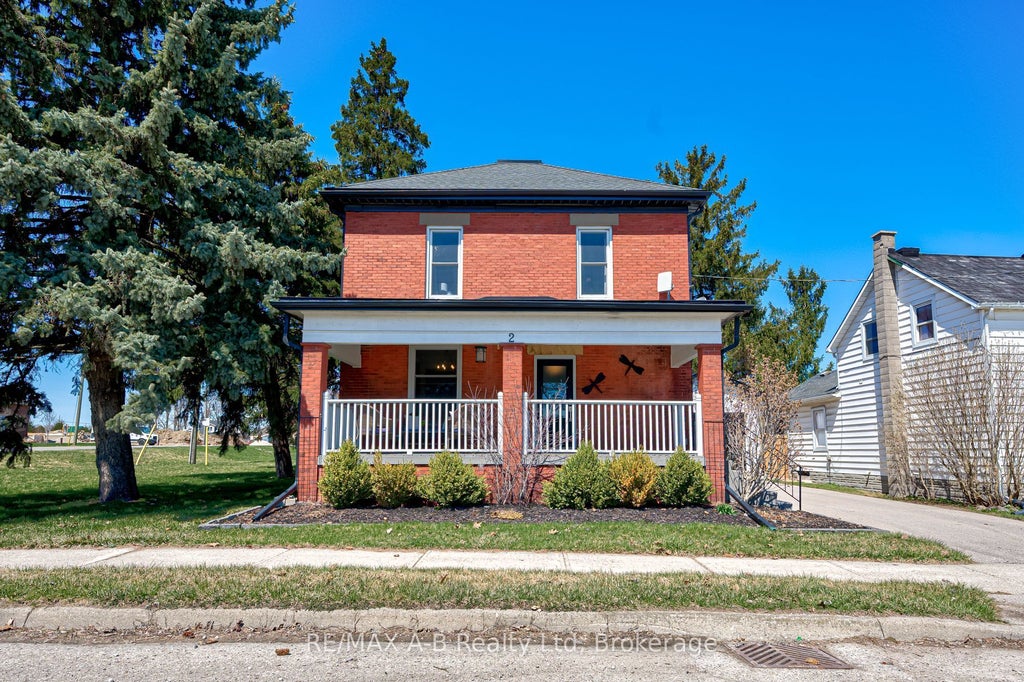 Welcome to 2 Lovey St E, Hickson. This stunning 2-storey brick home on a corner lot, with 9 foot ceilings offers 4 spacious bedrooms and 2.5 bathrooms! Recently updated with modern finishes, including brand-new flooring, windows, a new roof, and furnace, all ensuring it's move-in ready. The bright, open kitchen features gorgeous quartz countertops, providing a sleek and durable space for cooking and entertaining. The main-level bedroom, currently used as a playroom, offers great flexibility, perfect as a home office or as the original bedroom. Convenience is key with the second-floor laundry room, making chores a breeze. Step outside to enjoy a large, fully-fenced backyard with a brand new deck ideal for gatherings, and a new 1.5-car detached garage that is currently set up as a gym but can easily be converted to suit your needs. In close proximity to Woodstock, Shakespeare, New Hamburg, Tavistock, Stratford and within walking distance to the Elementary school, conservation trail and snowmobile trail. With plenty of upgrades, a spacious yard, and chic design throughout, this home is a must-see!