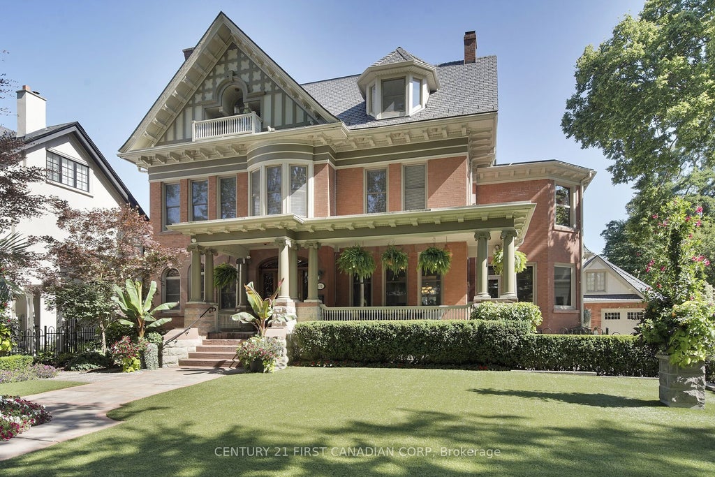 The two-and-a-half-storey red brick house at 191 Cheapside Street reflects a typical late Edwardian style, but on a grander scale that allows for striking architectural flourishes. Hallmarks of the style include a hipped roof with cross gables, tall corbelled brick chimneys, a large front gable over a projecting wall, and a broad porch that wraps around the west side. Notable features include broad eaves with large modillions, intricate half-timbering in the gable apse, a Palladian window-door opening onto a balustraded balcony, and an octagonal Scottish dormer with sash windows. The porch features Ionic columns with limestone bases and red sandstone trim, and a balustrade with narrow balusters.The front entrance is particularly distinctive, with bevelled glass in the oak-framed door, sidelights, and elliptical transom, topped by a cylindrical bay window. These features are highlighted against a purposefully subdued backdrop: red brick with red mortar, minimal stone contrast, and orderly sash windows. Red sandstone trim appears in window sills, voussoirs, and along the limestone foundation.Additions to the house, including a flat-roofed sunroom and a 2008 rear extension, are faithful to the original design, replicating key details such as brick colour, eaves, and modillions. The property benefits from its setting on the wide, boulevard-lined west end of Cheapside Street. The current owners have developed a formal Renaissance garden in front, enclosed by a metal fence and visually linked to the house by shared architectural motifs like half-timbering. A driveway on the west leads to a two-car garage that echoes the main houses design.The house sits approximately 7.25 metres from the front property line and 22.5 metres from the street.