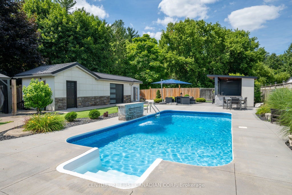 A home built for modern living & entertaining! Every inch of this beautifully crafted home is packed with luxury, comfort, and functionality. The main level - 3 spacious bedrooms are finished with crown mouldings, pot lights, and Cat 6 Ethernet wiring, ensuring both elegance and high-speed connectivity throughout. The primary suite is a true retreat, featuring a sophisticated tray ceiling for added dimension and a stunning spa-like en-suite. Thoughout the home, you'll find solid shaker-style wood doors, stunning 18x36 ceramic tiles, and engineered hardwood flooring flowing seamlessly from room to room. The bathrooms are showstoppers boasting coni marble showers, sleek glass barn doors, and stunning double sink floating vanities.The custom kitchen is a chefs dream, complete with shaker style self-closing doors that have full-extension, and crown moulding finishes that carry throughout the home. The Living room features a cozy gas fireplace and has double sliding doors that lead to your private outdoor oasis. The basement continues the luxury with a Dricore subfloor, stylish LVP flooring, and a second gas fireplace perfect for movie nights or entertaining guests and an additional 3pc Bathroom. Now for the showstopper...your backyard retreat! The 10x16 covered porch overlooks a gas-heated saltwater pool with a tranquil waterfall feature. The fully outfitted Cabana includes a Kegerator, gas BBQ, and a glass beverage fridge, creating a true entertainer's paradise. For car lovers, the heated 2-car garage is a dream come true. Outfitted with epoxy floors and 65K bulb lights, ideal space for detailing, showcasing, or working on your vehicle year-round.Additional upgrades include a steel roof (2017), Pool (2017), Pool Pump(new 2017, installed in 2025), crank casement windows and doors (2021), a 200 amp panel (2024), plus separate electrical panels in both the garage and shop/pool shed. This home is more than move-in ready it's a complete lifestyle upgrade!