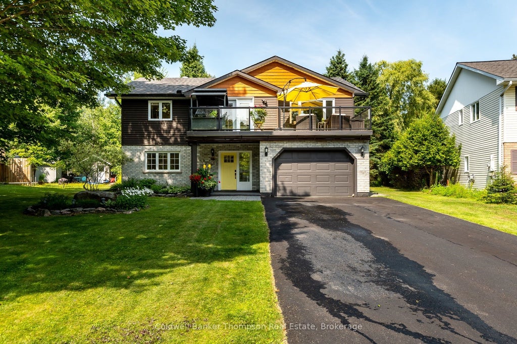 Welcome to this beautifully updated and lovingly maintained family home, perfectly situated in a desirable neighbourhood in Huntsville. With excellent curb appeal, the grey-toned brick and vinyl exterior is complemented by attractive landscaping, a covered entry, and plenty of parking in the double driveway and attached oversized single-car garage. Step inside to a spacious foyer with a large closet, leading into a bright and expansive living room featuring a cozy natural gas fireplace and french doors to the private backyard. The outdoor space offers a patio with a gazebo, a level grassy lawn ideal for kids or pets, and room for gardening. Also on this level is a good-sized bedroom, a 3-piece bathroom with a corner shower, and a versatile office that could serve as a fifth bedroom if needed. A generous mudroom/laundry area offers inside entry to the garage and adds functionality to everyday living. A striking glass railing staircase leads to the upper level, where the heart of the home awaits. The stunning kitchen boasts quartz countertops, a centre island, stainless steel appliances including a stove with a natural gas range, and abundant cabinetry. This open-concept space flows into the dining and living areas, with sliding doors to a sunny deck featuring glass railings, a lounging area, and a covered BBQ space. Upstairs, you'll also find three generously sized bedrooms, including a stylish primary suite with a walk-in closet and sleek 3-piece ensuite with tile and glass shower. The remaining bedrooms share a well-appointed 4-piece bath. This move-in-ready home is on full municipal services, including water, sewer, natural gas, high-speed internet, and curbside garbage/recycling. Enjoy the convenience of nearby schools, the Summit Centre, shopping, dining, and community events downtown. A thoughtfully improved and well-located home offering space, style, and practicality for families of all kinds.