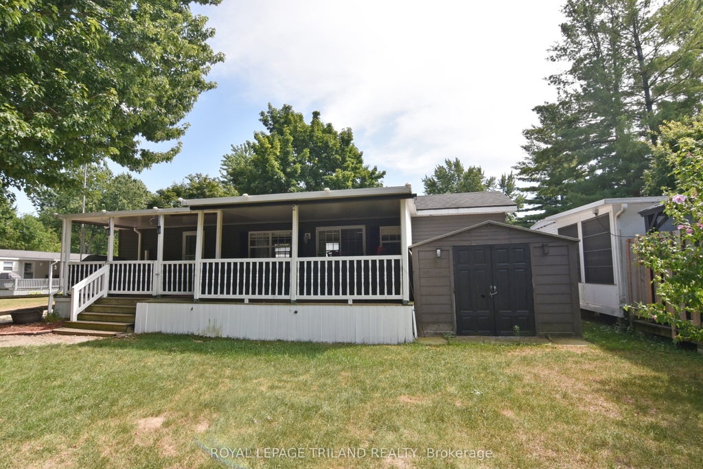 2011 NORTHLANDER in OUR PONDEROSA - Seasonal (6 months). Two bedroom / 1 bathroom. Large covered veranda with bar area...great for entertaining or relaxing. Open concept home with an elegant design. Fully furnished. Kitchen includes a gas stove, fridge with icemaker, microwave and lots of cabinets. Dining area with banquette. Living room with fireplace, built-in cabinets, and transom windows. Primary bedroom accommodates a queen bed, double closets and built ins. Second bedroom has bunk beds on both sides...left lower bunk turns into a table and seating area. Updated 4 piece bathroom with tub and shower. Lots of windows throughout. Plenty of storage. Forced-air propane gas furnace and C/A. Surround sound speakers. Wired for satellite tv and internet. Shed is 8' x 10'. Corner lot with a nice front lawn and firepit area. Home is skirted all the way around. This could be the perfect " home away from home". Available from April - October. Fees paid up until end of October 2025. Park amenities include a membership to the 9 hole golf course, 2 pools with waterslide, pickleball, basketball, horseshoes, playground, kids programs, chip wagon and evening entertainment if desired. Just a few minutes to Ipperwash Beach...rated one of the best beaches in Canada. Less than an hour from London, 30 minutes from Sarnia.
