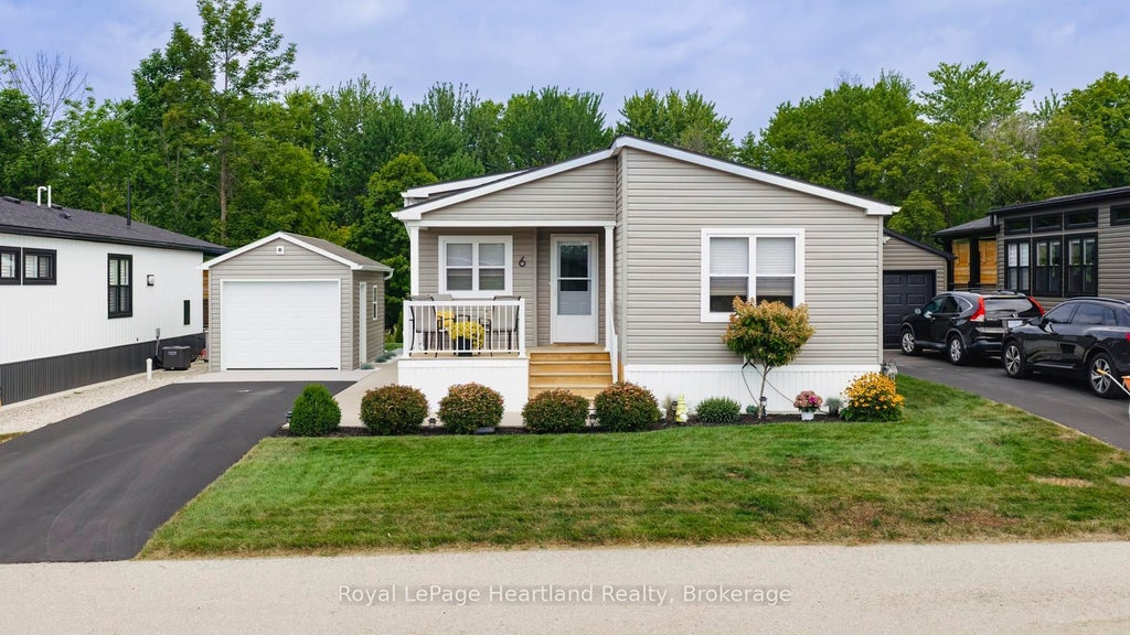 Here's a rare opportunity! Exclusive Location backing onto a beautiful ravine with trees at Bluewater Shores. Discover this spotless, like-new home in the sought-after Bluewater Shores land lease community. Tucked in a private setting with trees as your backdrop, you'll love relaxing on the covered back porch and enjoying the peace and privacy. Inside, the open-concept layout is fresh and modern. The kitchen features a large island, coffee bar, backsplash, and plenty of cabinetry. The living room is highlighted by an electric fireplace with a shiplap mantle, creating a cozy focal point. With 2 bedrooms plus an office, there's room for guests and a home workspace. Additional features include: forced air gas heating and central air, extended driveway, shed, eavestroughs, patio, gas BBQ and beautifully landscaped grounds, plus No HST on purchase. As part of Bluewater Shores, you'll enjoy exclusive amenities: private sandy beach with incredible sunsets, heated outdoor pool, clubhouse with indoor pickleball court, and a warm, welcoming community. Bluewater Golf Course is just up the road, and the charming town of Bayfield is minutes away. This move-in ready home offers the perfect blend of modern comfort and resort-style living.