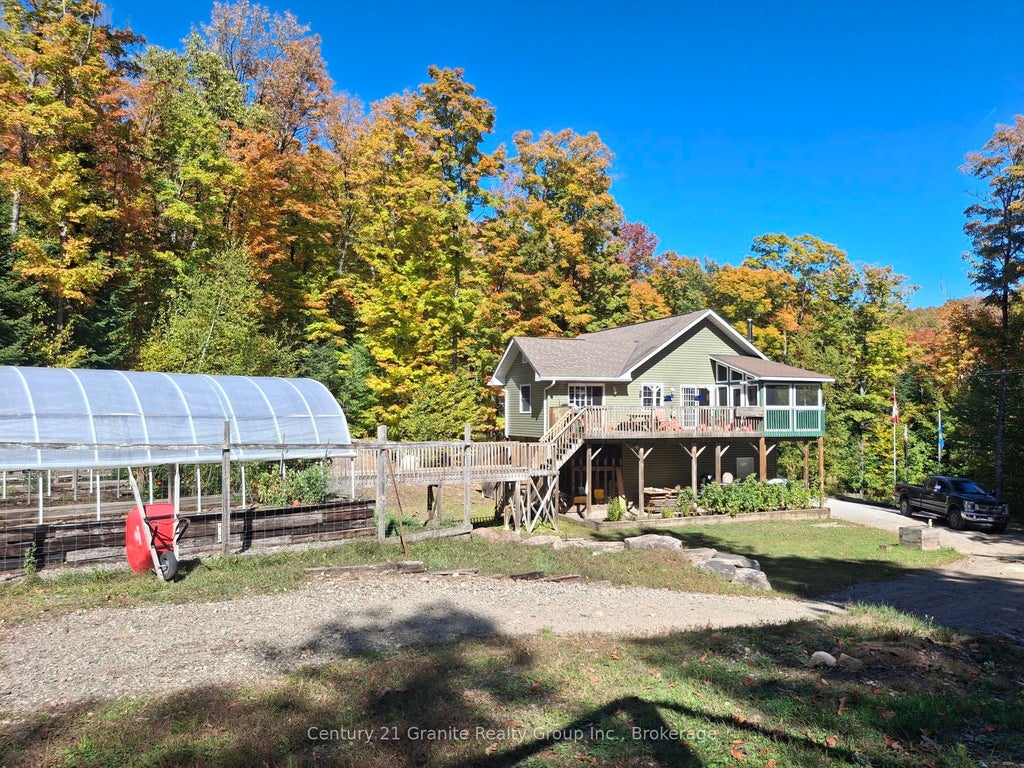Escape to your private off-grid hobby farm on a secluded 37-acre property, just 10 minutes from Haliburton Village and minutes from Drag Lake's boat launch and beach. This rare offering includes 3 separately deeded lots, providing endless potential for future opportunities while ensuring incredible privacy. Set back from the road, down a winding driveway, the property opens to a beautiful clearing where you'll find the main homestead with an attached two-car garage. The 3-bedroom, 1-bathroom home is designed to take in the views, with the main living spaces located on the upper level. The open-concept living, dining, and kitchen area features vaulted wood ceilings, custom kitchen with island and a walkout to a screened-in sitting room and deck, overlooking the surrounding gardens and forest. The spacious primary bedroom offers a built-in wardrobe and walkout to the deck, with two additional bedrooms (one currently an office with built-in storage), a 3-piece bathroom, and convenient laundry closet completing the layout. The homestead is surrounded by beautifully landscaped gardens, three greenhouses and a bird enclosure, perfect for those looking for a self-reliant lifestyle. The property also boasts an insulated and heated barn with winter water and fenced pasture, ideal for horses or other large animals. A separate heated, insulated garage/workshop and oversized storage building provide excellent space for a home-based business, studio, or extra storage for recreational toys. This property is fully off-grid, powered by both solar and a wind turbine, providing sustainable energy for the home, barn, and workshop. Looking for a simpler set-up? Hydro is available only 200 meters away. Offering a blend of modern comfort, natural beauty, and practical features, this hobby farm is a true Haliburton Highlands retreat with endless potential.