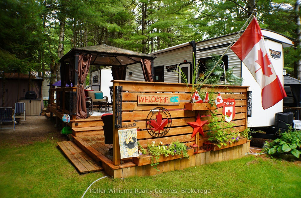 2023 Wildwood Lodge 42QBQ with extended warranty until 2029. This turn-key retreat is ready to enjoy, offering comfortable accommodations for up to 10 guests. The bright, open layout features a cozy fireplace, smart TV, accent lighting, and flexible seating and dining configurations with storage underneath. The farmhouse-style kitchen includes a residential fridge, pantry, and ample cabinetry. The spacious front bedroom offers excellent closet and drawer space, while the rear bunkhouse is designed for versatility set up with three bunks and a couch, or three bunks and a queen-sized bed. A 50 LED TV creates the perfect spot for gaming or movie nights, and the space could also be adapted as a home office or hobby area. The back bedroom includes its own powder room with direct deck access. Outdoor living is exceptional with a freshly sealed multi-level deck, screened gazebo with ceiling fan and side curtains, outdoor kitchen, bar top with stools, shed with fridge, BBQ, outdoor furniture, two kayaks, lawn mower, bicycles, and more all included. The park amenities are equally impressive with multiple playgrounds (including one behind the site), two indoor pools with hot tubs, a beach area with inflatables, dock space, boat rentals, general store, walking trails, outdoor games, and close proximity to the Black Horse Golf Course. This property combines comfort, flexibility, and unbeatable amenities ready to be enjoyed from day one