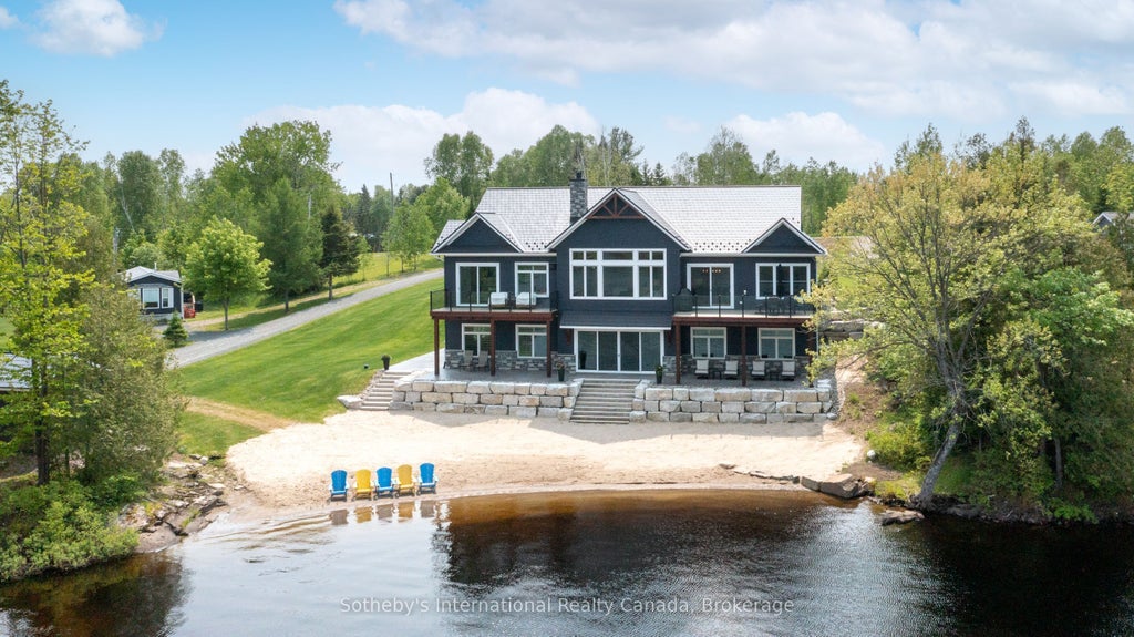 Welcome to 19 Bears Paw, a standout luxury cottage drenched in all day sun offering 175 feet of clean, sandy shoreline on sought-after Whitestone Lake. Set on a gently sloping, landscaped lot, this turnkey, fully winterized retreat blends refined interior finishes, premium mechanical systems a rare combination in todays market. The main cottage offers approximately 5000 sq. ft. of finished living space across two levels, featuring vaulted ceilings, wide-plank hardwood floors, custom millwork, and a gourmet kitchen outfitted with Wolf stove and Miele fridge , a beverage fridge, and ice maker. Enjoy 5 spacious bedrooms, including a main floor primary suite with a spa-style ensuite and walk-in closets. The walkout lower level adds a wet bar, games area, gas fireplace, home gym, and a dedicated sauna perfect for year-round entertaining and relaxation.