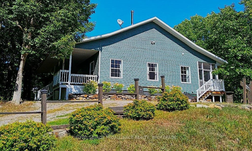 A timeless debate whether to buy land with acreage, or waterfront. How about a country year round bungalow that has the bonus of ownership in a waterfront lot on Sharbot Lake, and also backs onto approx. 600 acres of crown land! Sitting on a tranquil private lot at just under 2 acres with mature trees sprawling the property which shades this single level home. The airy layout is covered with beautiful pine floors throughout the living room, dining and kitchen, with 2 bedrooms and a freshly updated spacious bathroom. Enjoy morning coffees on the covered veranda that stretches the length of the home, or the screened in rear enclosed porch with half setup as a 3 season room heated with a wood stove, making a great seasonal guest sleeping or additional space off the primary. The large detached 20x30ft garage is great for the toys you'll need to enjoy the land and water, and launch your boat at the shared waterfront just a couple of lots over with great swimming, fishing and beautiful views. On a municipal road with fiber internet allows you to work from home or just stay connected, minutes to amenities in Sharbot Lake village, 25mins to Perth, an hour to Kingston or Ottawa, and away from it all.