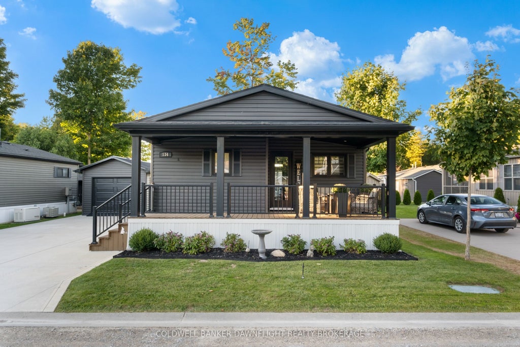 Welcome to Birchbark Estates, where this beautifully maintained Northlander home, built in 2019, offers 1,012 sq. ft. of comfortable living just minutes from Grand Bend and the shores of Lake Huron. The open-concept main floor features a bright white kitchen with quartz countertops, a spacious island with seating for four, and a welcoming living room complete with an electric fireplace and shiplap surround. The home includes two bedrooms, highlighted by a primary suite with a walk-in closet with built-ins, a second electric fireplace with matching shiplap detail, and a private 4-piece ensuite with a walk-in shower and double vanity. A second full bath and a well-appointed laundry room with built-ins add convenience. Outdoor living is enhanced by a large covered front porch, perfect for entertaining, along with a 10x10 garden shed and an insulated 12x18 garage. Residents enjoy a monthly fee of $445, which covers road maintenance, snow removal, garbage, water, and sewer. An additional parking area is available for trailers, campers, and boats. The community also offers optional access to an indoor pool and fitness facility. Additional features include a forced-air gas furnace, central air, and even the option to drive battery-powered golf carts throughout the neighbourhood.
