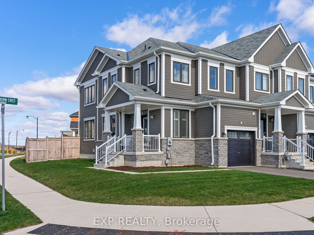 Discover this move-in ready corner-unit freehold townhome, built in 2022 and nestled in a growing, family-friendly neighbourhood just 30 minutes from Hamilton. Step inside to find thoughtful upgrades throughout, including quartz countertops, maple kitchen cabinets, upgraded appliances, and a single pot light -- providing an easy opportunity to install additional lighting. A striking oak staircase leads to the upper level, where the primary bedroom features a custom vanity with added height for enhanced comfort. The unfinished basement includes a rough-in for a 3-piece bathroom, offering future potential to expand your living area. Enjoy the practicality of an attached single-car garage and the bonus of having a park with tennis courts directly across the street. With a new Catholic and public school, as well as a community centre featuring 49 childcare spaces newly completed, this is a fantastic opportunity to become part of a welcoming and rapidly developing community.