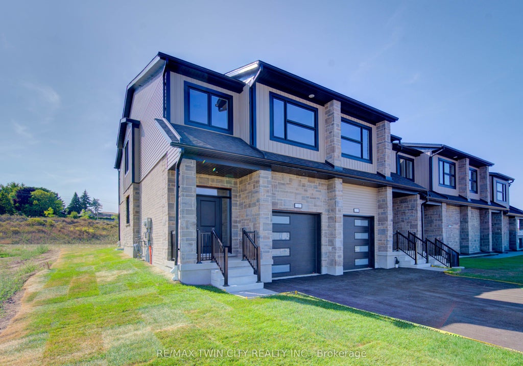 Welcome to this stunning, brand-new end-unit townhome, featuring a beautiful stone exterior and a host of modern finishes youve been searching for. Nestled in a desirable, family-friendly neighborhood, this home offers the perfect blend of style, comfort, and convenienceideal for those seeking a contemporary, low-maintenance lifestyle. Key Features: Gorgeous Stone Exterior: A sleek, elegant, low-maintenance design that provides fantastic curb appeal. Spacious Open Concept: The main floor boasts 9ft ceilings, creating a bright, airy living space perfect for entertaining and relaxing. Chef-Inspired Kitchen: Featuring elegant quartz countertops, modern cabinetry, and ample space for meal prep and socializing. 3 Generously Sized Bedrooms: Perfect for growing families, or those who need extra space for a home office or guests. Huge Primary Suite: Relax in your spacious retreat, complete with a well appointed ensuite bathroom. Convenient Upper-Level Laundry: Say goodbye to lugging laundry up and down stairs its all right where you need it. Neighborhood Highlights: Close to top-rated schools, parks, and shopping. Centrally located for a quick commute to anywhere in Kitchener, Waterloo, Cambridge and Guelph with easy access to the 401. This freehold end unit townhome with no maintenance fees is perfect for anyone seeking a modern, stylish comfortable home with plenty of space to live, work, and play. Dont miss the opportunity to make it yours!