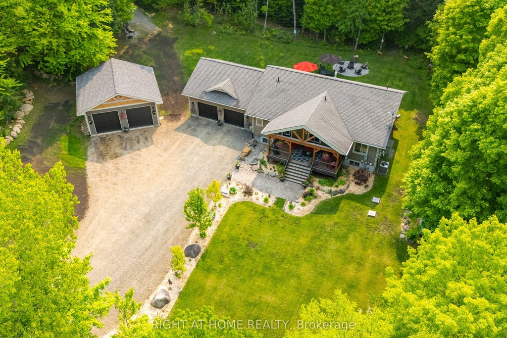 Private 5.5 Acres Lot - Where Nature and Comfort Live in Harmony, Here Life Slows Down and Peace Begins! Welcome to a rare gem that's more than just a home, it's a lifestyle. Charming, Maintained with love and tucked away on a stunning, very private and peaceful 5.5 acre lot, this charming bungalow offers full connection with nature with deer visiting your backyard from time to time and birdsong as your daily soundtrack. Step into your dream with this character-filled bungalow boasting 3+1 bedrooms & 3 full bathrooms, a layout perfect for comfort and flexibility. Approximately 3,000 sq ft of living space. The cathedral ceilings in the open-concept living area and kitchen create an airy, inviting space centred around a stunning gas fireplace, perfect for cozy evenings. The primary suite is a private retreat featuring a walk-in closet and a luxurious 5-piece ensuite overlooking serene greenery. Whether you're a car enthusiast or a collector of big toys - this property has room for it all!You'll be thrilled with the attached 27'6"x27' garage PLUS a newly built 24'x24' heated detached workshop/garage with concrete slab, ideal for year-round projects, storage, or hobbies. The finished basement offers a huge great room with a solid wood bar, large above-grade windows, an extra bedroom, and plenty of storage to customize for your needs. Pet parents, rejoice! A dedicated mudroom with a dog shower makes daily life cleaner, easier, and even more pet-friendly. Step outside to your stunning front and backyard oasis, where peace, privacy, and panoramic nature views await. Sip your morning coffee on the deck as the forest whispers around you, its pure paradise. Enjoy the convenience of dual driveways and easy commutes on fully paved roads. You're just a short drive to shopping, public beaches, Lakeside Golf Club, groceries, and much more.This isn't just a move it's a rare opportunity to live the lifestyle you've dreamed of for very affordable price!