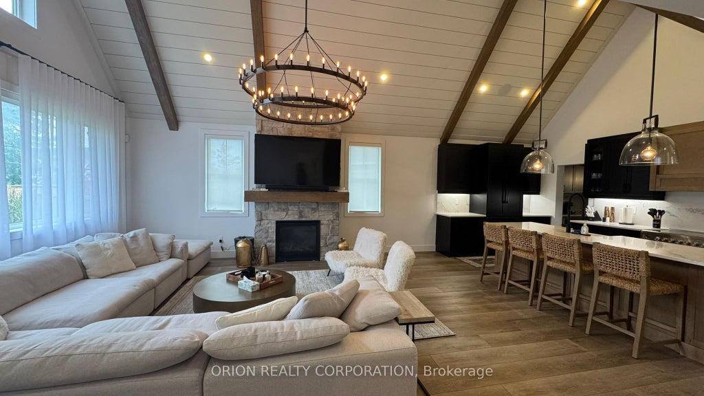 *FURNISHED SEASONAL LEASE * This spectacular 6 bedroom Beckwith model is nestled in the highly sought-after Windfall community, walking distance from Blue Mountain Village and Downtown Collingwood. Designer decorated with furnishings from Restoration Hardware & Crate and Barrel. Perfect for entertaining, the chefs kitchen boasts stainless steel appliances and an oversized breakfast bar. The open-concept great room is enhanced by a floor-to-ceiling stone fireplace and 16-foot cathedral ceilings. The master bedroom is a luxurious retreat, featuring a spa-inspired ensuite with a double vanity and beautiful glass shower. This thoughtfully designed layout includes a second master suite with a spacious walk-in closet and its own ensuite bathroom. The fully finished basement offers two additional bedrooms, a large recreation room with ample natural light from oversized windows, extra storage space, and a 3-piece bath with a glass shower. Additional highlights include an oversized garage and ample parking in the driveway. Immerse yourself in this community that appreciates the four-season playground the area has to offer just steps to The Shed a private clubhouse that includes an outdoor pool, hot tub, sauna, gym and lodge with an outdoor fireplace.
