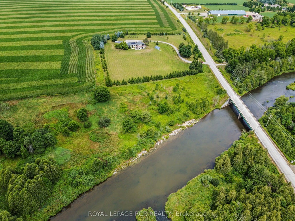 A winding driveway draws you toward The Riverlands, a spectacular top-of-the-line modern estate offering over 7,000 sq ft of total space. Nestled on 3.67 acres with commanding views of the Grand River, this architectural gem was originally built between '67 and '70 and underwent an extraordinary full-scale renovation from '20 to '22. Today, it stands as a seamless fusion of timeless design and forward-thinking sustainability, boasting carbon-neutral, net-zero-ready systems. The main level features a stunning chef-inspired kitchen with quartz countertops, custom cabinetry, and an impressive suite of appliances. Sliding doors lead to a stone patio with a fireplace and BBQ, perfectly positioned to enjoy the sights and sounds of one of Ontario's premier fly fishing destinations. The open-concept living and dining area is enhanced by natural light, bespoke walnut built-ins, and sweeping river views. The primary suite is a private retreat, complete with a five-piece ensuite, custom dressing room with integrated laundry, and access to a versatile den or office with a wood-burning fireplace and access to the rooftop terrace. Two more bedrooms offer walk-in closets and share a beautifully updated bath. A curved staircase leads to the lower level with a second kitchen boasting an indoor charcoal grill, a family room with fireplace, a billiards room, a guest suite, a wine room, and a walk-in fridge, making this a true entertainer's haven with in-law potential. The showstopping indoor saltwater pool has dedicated HVAC and solar-powered heating, plus a sauna, change room, and adjoining sunroom with walkout to the backyard. Rooftop solar panels, geothermal systems, upgraded electrical, smart home features, and plans for a detached 3-car garage complete this one-of-a-kind package. Just minutes from Belwood Lake and downtown Elora, The Riverlands is a rare blend of modern luxury, natural beauty, and sustainable living.