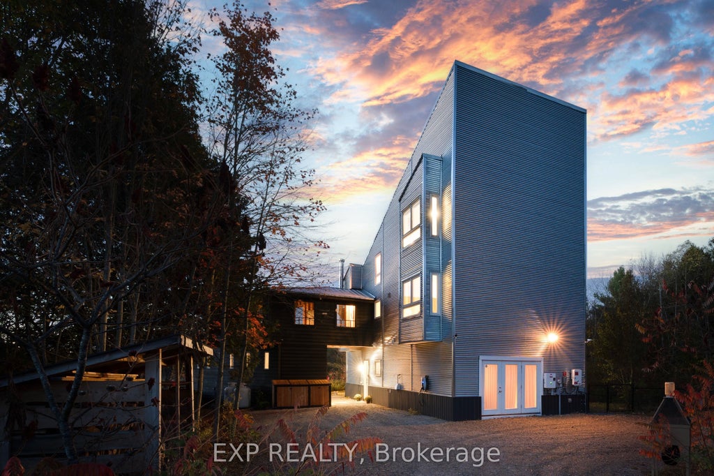 **Large Modern Architectural Home on 25 Acres of Mixed Forest Overlooking the Wetlands that Feed Beaver Lake** Set on 25+ private acres of forest, granite, and protected wetlands in Stone Mills, this striking modern residence was built in 2014 and designed to live in balance with its surroundings. Constructed of galvanized steel, black accents, and natural wood, the home's design captures light and landscape in equal measure. Large, well-placed windows frame the water and trees, while the surrounding wetlands-alive with herons, beavers, owls, eagles, fish, turtles, and migratory birds-create an ever-changing natural backdrop. Inside, the main floor has been beautifully completed with a 4th spacious bedroom being used as an office, new tiled bathroom, and new welcoming foyer. Upstairs, the open-concept living area features soaring ceilings, hardwood floors, a wood-burning stove, and thoughtful details including stainless-steel countertops and custom tilework. The primary suite crowns the home: a loft-style retreat with a deep oversized soaker tub overlooking the wetlands, new oversized black tiled shower, and treetop views that shift with the seasons. A powered Quonset building provides flexible space for a workshop, studio, or storage, and a fenced dog yard adds daily convenience. Extensive forest trails and road frontage. Possibility of severance or building of a second residence - buyers due diligence. Located within Ontario's renowned Dark Sky region, nights here are spectacular-clear, starlit skies where the Milky Way feels close enough to touch. Private. Sustainable. Architectural. All within easy of Tamworth (4min), Kingston (30min), Napanee (20min), Prince Edward County (40min), and Belleville (45min).