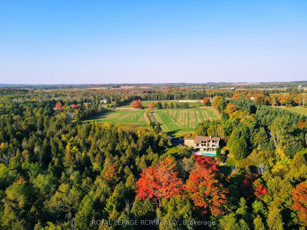 Welcome to Nature's Door, 33 gorgeous acres in the Town of Mono with a river running through it. An exceptional property offering endless enjoyment with the backyard vista overlooking the Nottawasaga River. This custom-built home was overseen by a local entrepreneur who purchased the property and hired the finest local trades to build this impressive home. The great room with large windows, vaulted ceiling and soaring floor to ceiling 19ft natural stone Fireplace is spectacular. Completely renovated kitchen with quartz countertops, Café appliances and wide plank flooring. The pantry with bar fridge is just as impressive with its vaulted ceilings and natural light flowing through the space. Open riser staircase leads you to the loft library then onto the principal bedroom with five-piece ensuite and a private balcony overlooking the property. Lower level is fully finished with family room, Stone Fireplace, bar, powder room, office, large bedroom with ensuite. Each of the three rooms have garden doors walking out to the pool patio with the pool surrounded by gardens and breathtaking natural views. The home is comfortable and spacious to invite friends and family up for country weekends. Looking for more office space, there is a private office above the garage with its own staircase and views over the back of the property. Outbuilding consisting of three stalls, storage and a garage is ideal for pursuing hobbies or anyone wanting to keep horses on the property. The property features two paddocks, open fields, forest with cedar and massive mature maples with a river running through the middle of the property with a heavy-duty bridge to access the back acreage. Property is located just north of Caledon in Hockley Valley and is 1 hour from Toronto, 15 minutes to Orangeville and provides easy access to area amenities such as Mono Cliffs, Hockley Valley Resort, Adamo Winery, The Bruce Trail, Mansfield Ski Club and many local restaurants.