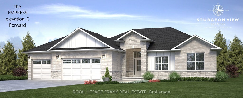 The Empress, 1766 sq.ft. Custom built home on oversized lot with forest in the backyard and full walk out basement! Featuring 3 Bedrooms, ensuite bath, walkin closet in Primary Bedroom. Great Room finished with gleaming hardwood floors, open concept to Kitchen. Choose your Elevation finish, this Model is featured as "A"with forward facing double car garage (third bay optional). Fibre Optics recently installed for the best in high speed internet. Short stroll to the private docking for Sturgeon View Estates, offering 160'dock. Sturgeon Lk. part of the Trent Severn Waterway. Tarion Builder attention to detail. Situated between Bobcaygeon and Fenelon Falls, and just 5 minutes from a Golf and Country Spa, which offers dining and accommodations, along with a public golf course. Book your showing and tour our standing Models! POTL is for the block of land to the dock, known as 27 Avalon Dr., $66.50 a month for maintenance and Reserve Fund. All homes are Freehold. Picture is The Empress Elevation C forward facing.